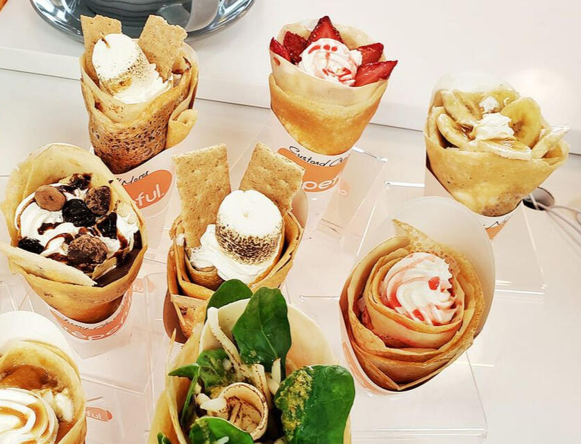 Nothing like a delicious crepe filled with absolutely delectable ingredients that will leave you feeling not so guilty!Luv-U-So-Matcha Green tea ice cream, Devil's Chocolate cake pieces, a dusting of matcha powder, a drizzle of dark chocolate, and a sprinkle of almonds.