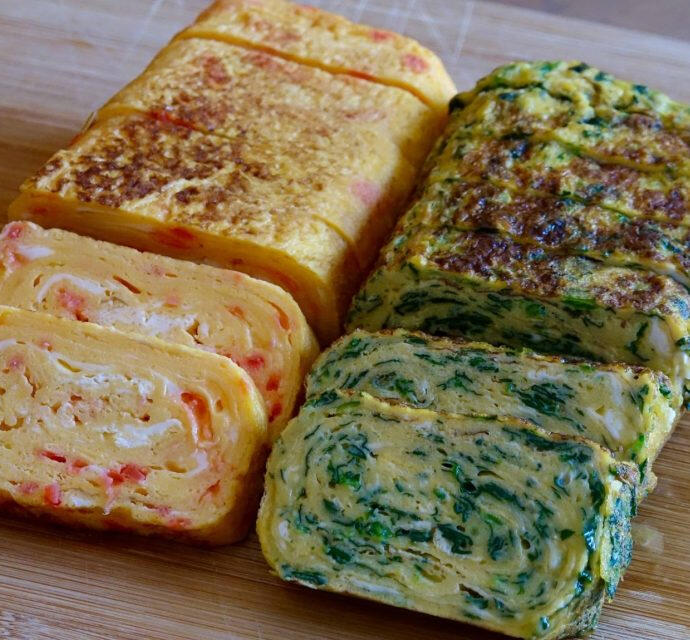 Fluffy and airy rolled omelette with a mild tangy sweetness Yokai and Akashi love! One version is made with pickled red ginger adding that lovely acidic vinegar taste. The other version is made with a mix of spinach and shiso leaf, offering a slight earthy bitterness and a light peppery taste from the shiso leaf, An irresistible flavor combination!