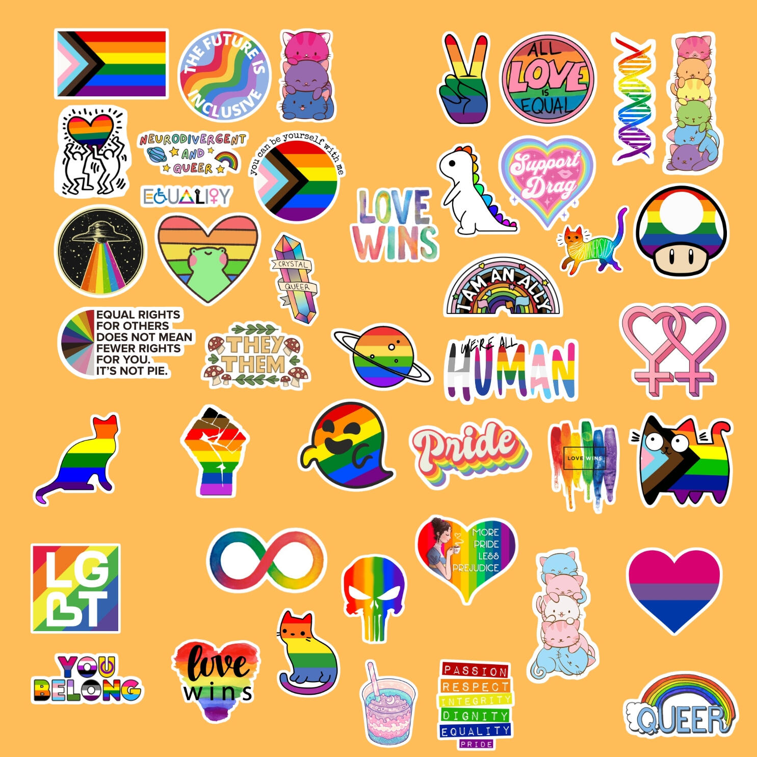 You will love our 42-Piece Sticker and Magnet Sets! Each with a random assortment of Pride stickers containing iconic imagery, memes, inspirational, and pop culture references.