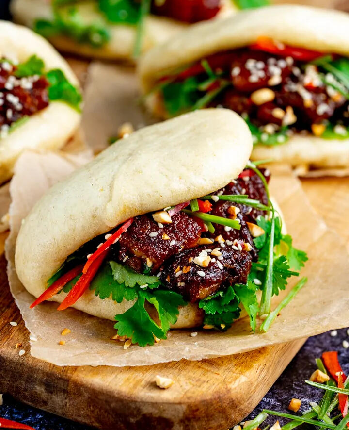 A tender, juicy piece of thick pork belly with a nice layer of fat. It is marinated in a spicy, sweet, and tangy soy sauce mixture. It is sandwiched between two bouncy pieces of freshly made bao, with red bell pepper, parsley, and then topped with sesame seeds and roasted garlic.Absolutely addicting! You won't be able to resist having just one!